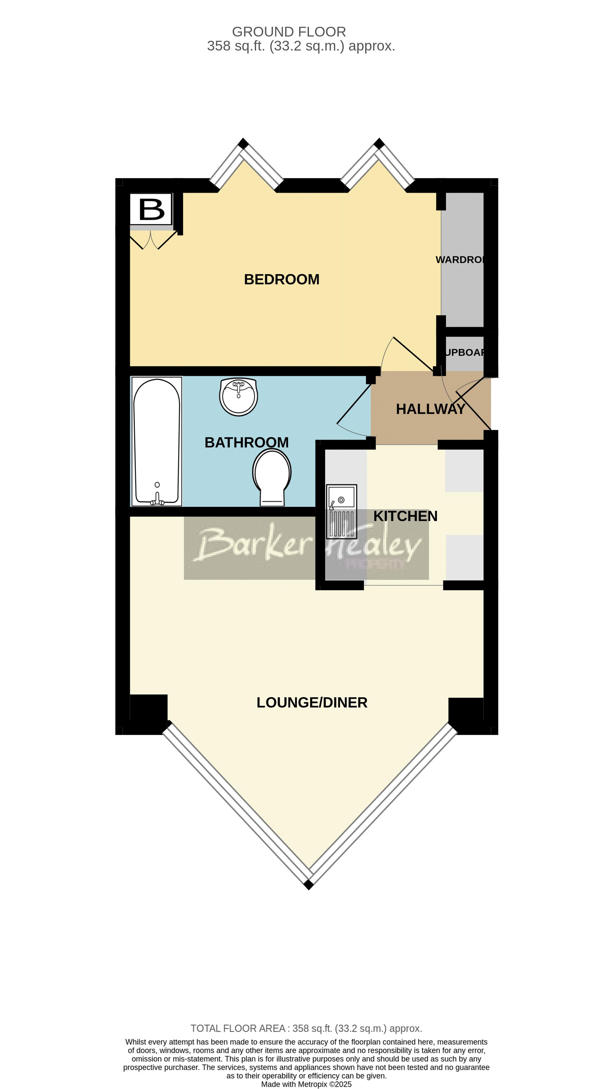 front door from communal hallway into entrance hallway which provides direct access to Bedroom, Bathroom & Kitchen. Door to built-in storage cupboard.